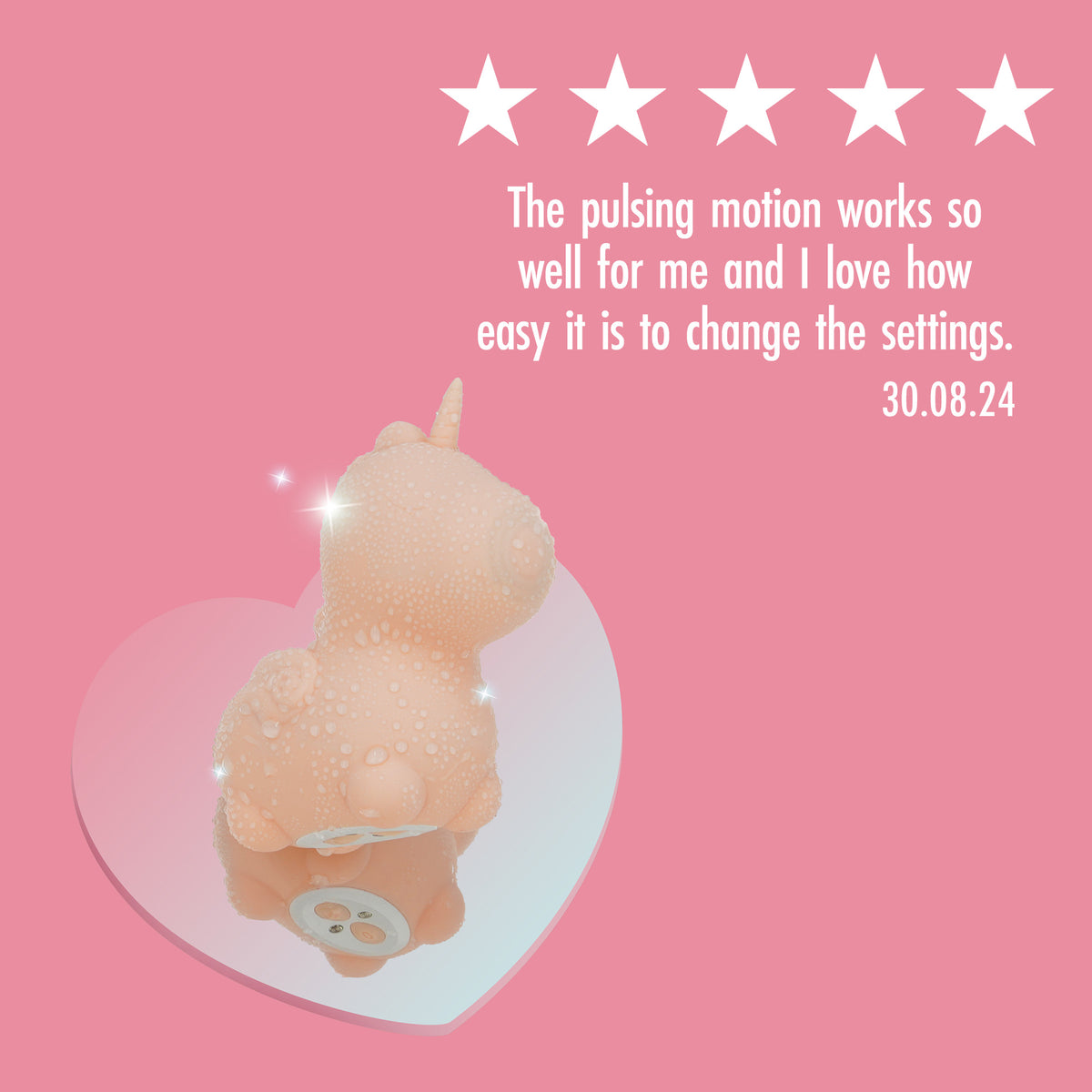 Heart Throb Unihorn clitoral vibrator  covered in water droplets on a mirrored heart with a pink background